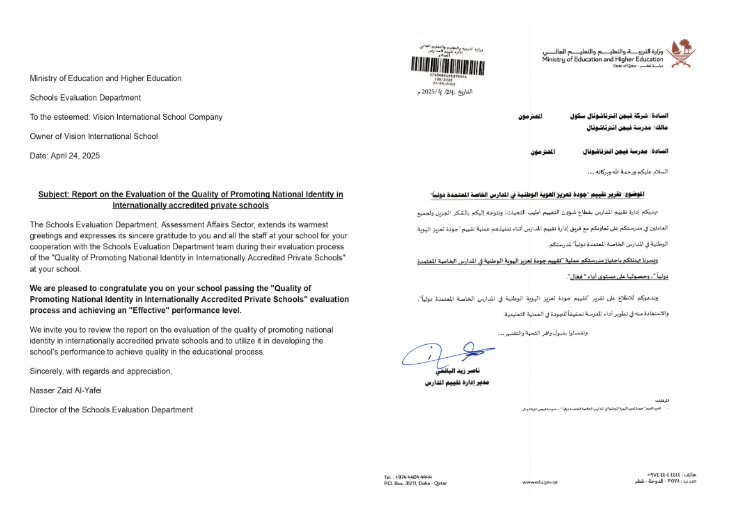Vision International School received the National Identity Enhancement Accreditation for Private Schools on April 24, 2025, awarded by the Ministry of Education and Higher Education in Qatar. This accreditation reflects our commitment to applying national quality standards and promoting Qatari national identity, Islamic values, and cultural heritage across all aspects of the educational process.