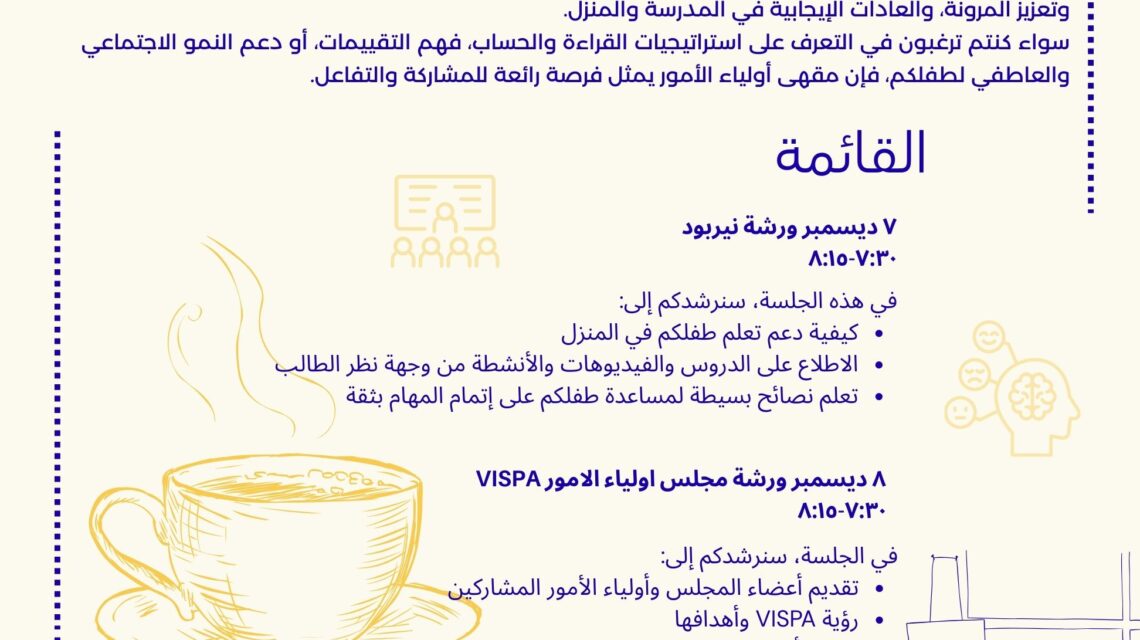 !انضموا إلينا لفرص مميزة للمشاركة ودعم تعلم أطفالكم :سجّل حضورك ورشة نيربودhttps://forms.gle/bGcCqA3T7oEwkfgS9 ورشة مجلس أولياء الأمورhttps://forms.gle/rjTsuwr71UCWsdF59